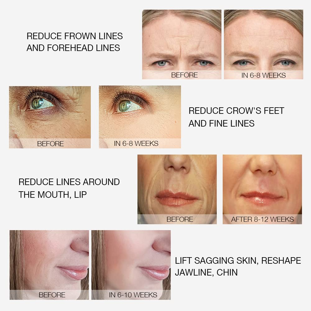 • VISIBLE RESULTS IN AVERAGE 40 - 90 DAYS! Results from 50,000 customers aged between 20 and 70 from cooperative beauty salon show that 90% saw their skin looked overall healthier in the first week, over 73.3% saw visibly improved elasticity & firmness in 6-8 weeks. After 8-12 weeks of use, 78% saw a more lifted look, 85% saw visibly plumper, more volumized skin. 75% saw a more contoured jawline and body contouring. Fine line and wrinkles start to fade in 8 - 12 weeks of use